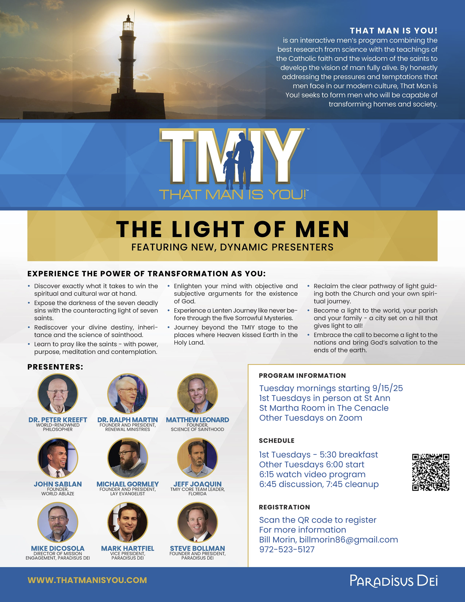 Become a man after God’s own heart. That Man is You! honestly addresses the pressures and temptations that men face in our modern culture, especially those relating to their roles as husbands and fathers. The program harmonizes current social and medical science with the teachings of the Church and the wisdom of the saints to develop the vision of man fully alive!